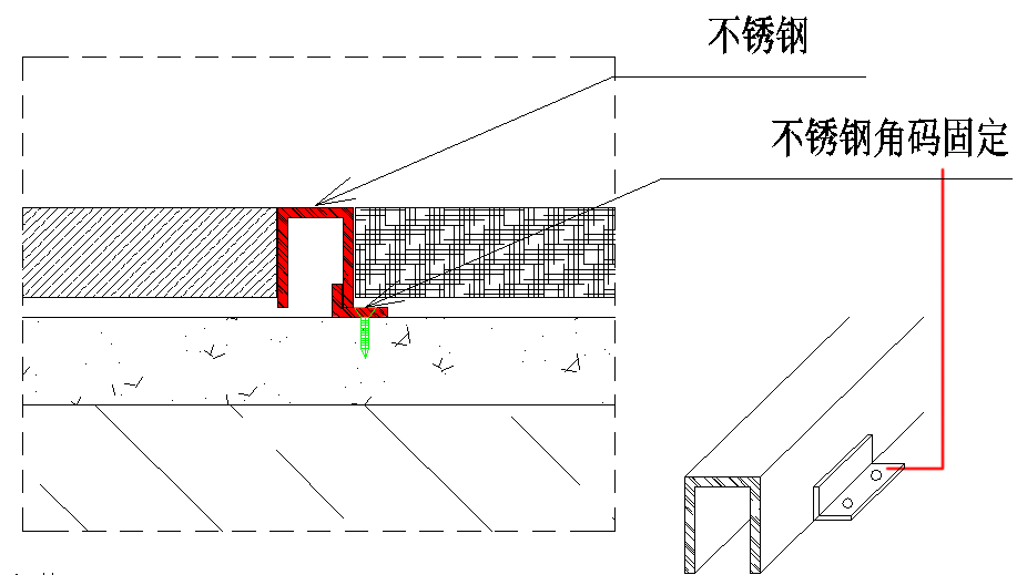 ,这样不锈钢与地面的安装无需做侧面支撑。弊端是工地现场尤其是抢工项目,地毯的安装可能会滞后,码片的牢固度不够还是会踩倒U型嵌条,造成了不停的修补无,形中